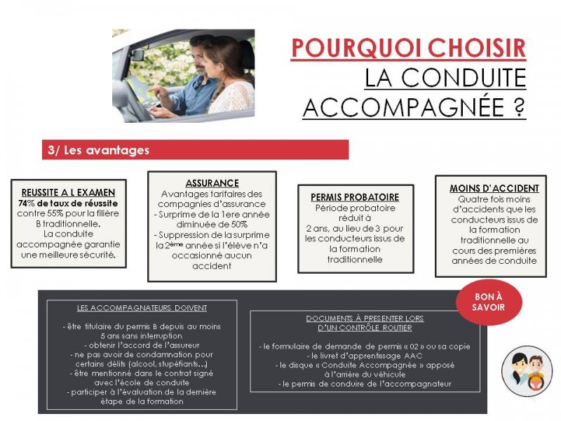 Depuis le 1er novembre 2014, la conduite accompagnée est disponible dès 15 ans. Elle offre l'avantage de pouvoir passer l'examen du permis de conduire dès 17 1/2 ans. Le candidat pourra ainsi conduire seul le premier jour de sa majorité.